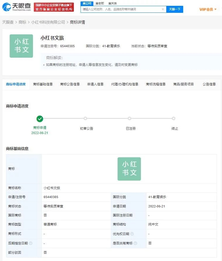 天眼查App显示,近期,小红书科技有限公司申请注册多个“小红书露营地”“REDCAMP”“小红书营地”“小红书文旅”等商标,国际分类包括餐饮住宿、教育娱乐、广告销售等,目前商标状态均为等待实质审查。